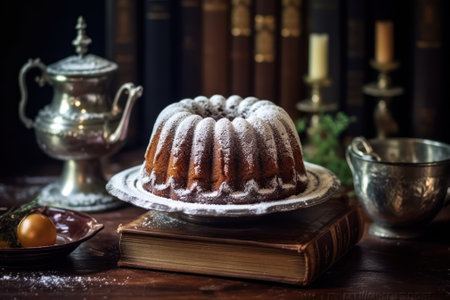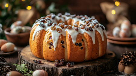 Delicious bundt cake topped with icing placed on a wooden table in a cozy setting