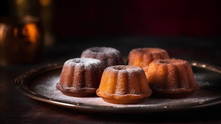 Caneles de bordeaux with rose under sunlight. French pastry Canele rum and vanilla flavor thick caramelized crust