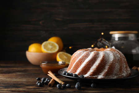 Cake with powdered sugar, berries and mint on wooden background, top view