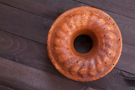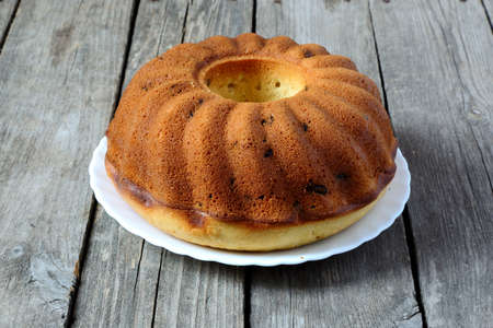 Festive homemade cakes. Round chocolate muffin, large muffin or cake with chocolate icing on a wooden ancient background. Place for text.
