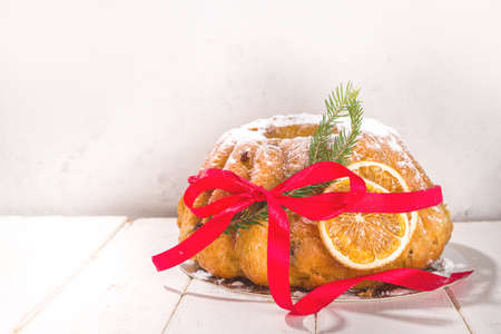 Homemade Christmas panettone cake, with Christmas tree branch and dried orange decor, Christmas and New Years festive baking background