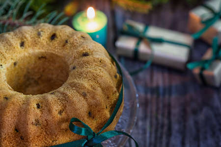 Pie with raisins and icing from powdered sugar on the background of fir branches and garlands. Rustic style, selective focus.