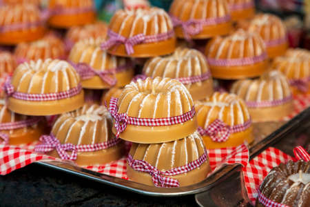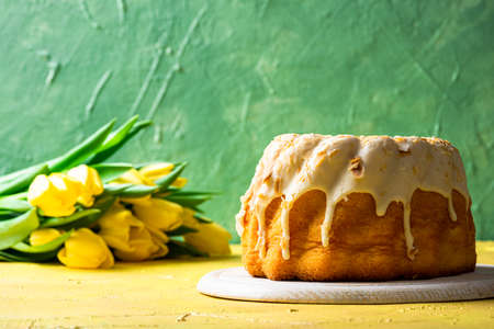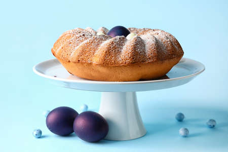 Easter cakes table in Poland. Easter pastry: babka cake. Easter in Poland - Wielkanoc.