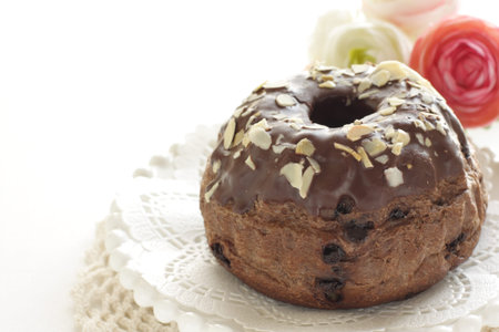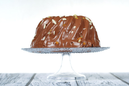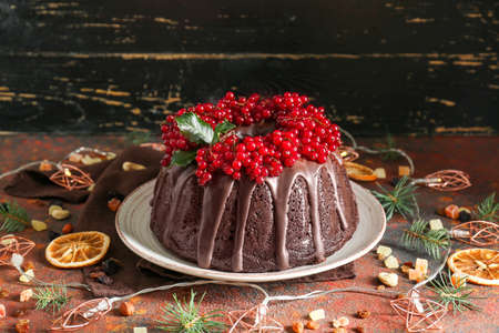 Delicious dessert, dark chocolate bundt cake topped with ganache glaze on rustic wooden background