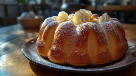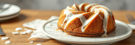 Delicious bundt cake served on a rustic wooden table with white icing drizzled on top during a cozy afternoon