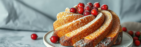 Delicious bundt cake topped with fresh cranberries and powdered sugar on a gray background
