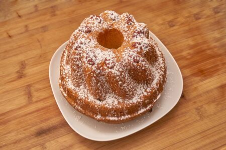 Homemade Kouglof cake with icing sugar dressing, Raspberries and Raspberry Filling. Gugelhupf, Kugelhupf or Christmas Cake