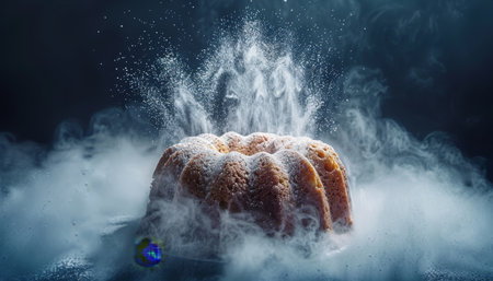 Minimalistic photography of a cinnamon dusted bundt cake on dark blue background top view