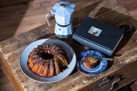 Easter cake, good book and hot coffee on old, dark wooden table - nice afternoon during stay at home.