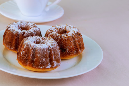 vintage Gugelhupf cake with icing sugar on white plate, standing on wooden table, dish towel beside the plate