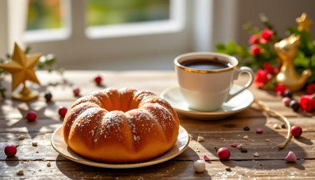 a cozy dining table setting with a freshly baked cake on a plate in the center. behind the plate, there's a warm beverage served in a cup. the table is adorned with festive decorations, including pine cones and christmas berries, suggesting a holiday celebration. the table appears to be near a window, as indicated by the natural light that softly illuminates the scene.