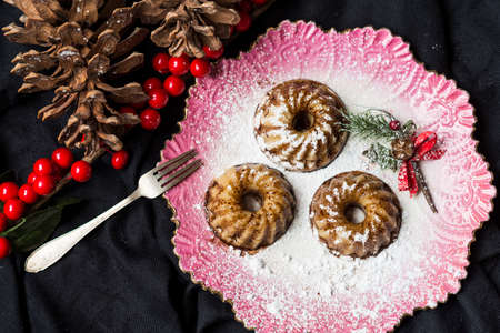 Still life with cakes decorated with chocolate and icing sugar on a pink plate, Christmas decoration and on a dark fabric background. View from above.