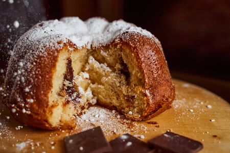 Cut homemade cupcake with chocolate cream inside sprinkled with powdered sugar on a wooden board. Close-up.. High quality photo