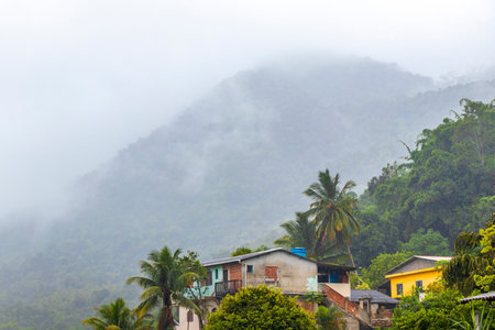 Tropical mountain with jungle forest trees plants dramatic rainy clouds monsoon rain and hazy mist in the sky on Ilha Grande Angra dos Reis State of Rio de Janeiro Brazil.