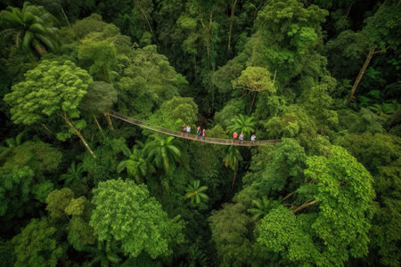 two people walking across a rope bridge in the middle of a rainforest canopy filled with green trees and lush vegetation. Generative Ai