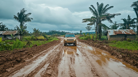 Off-road vehicle driving through thick mud on a remote village road, highlighting the rugged journey ahead.