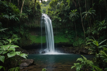 Breathtaking mountain landscape showcasing lush greenery and mist, creating a serene atmosphere in a tropical forest. Ideal for nature-themed projects.