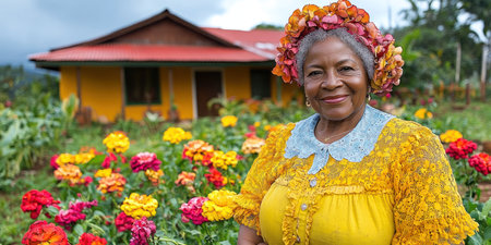 A joyful elderly woman stands surrounded by blooming flowers in a bright garden.