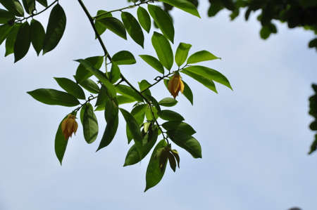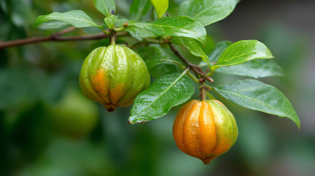 Tropical fruits Garcinia Gummi-Gutta hanging from the tree after the rain