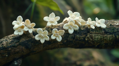 A serene scene featuring delicate white flowers perched on a rustic branch, set against a lush green backdrop. Perfect for nature lovers and botanical themes.
