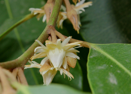 Calophyllum inophyllum (tamanu, mastwood, beach calophyllum, beautyleaf, Sinhala, Alexandrian laurel, balltree, beach touriga, Borneo-mahogany) with natural background.