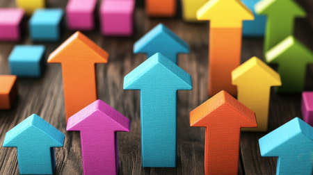 This image features vibrant wooden arrows pointing upwards amidst colorful cubes, symbolizing growth and progress in various fields like business or personal development.