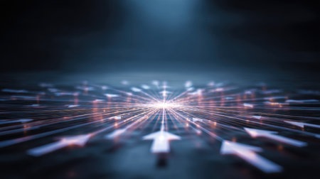 This abstract image illustrates the concept of growth and success, featuring glowing arrows pointing upward on a dark backdrop. It symbolizes ambition and progress.