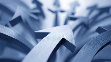 A striking abstract image featuring a collection of metallic arrows pointing in various directions, symbolizing movement, decision-making, and dynamic progress.