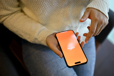 Chiang Mai, Thailand - May 15 2023: A woman login on her Payoneer application on her phone while sitting in a room. iPhone with Payoneer logo on screen. close-up image