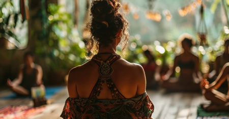 A serene outdoor yoga session at sunset, with participants on mats spread across the grass, the warm glow of the sun accentuating the peaceful ambiance and connection to nature.