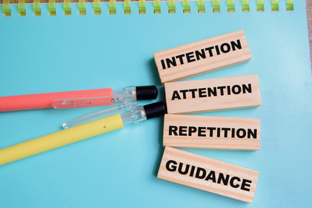 4 parts of discipline. Intention, attention, repetition and guidance on stacked wooden cubes on the table. Business and finance concept
