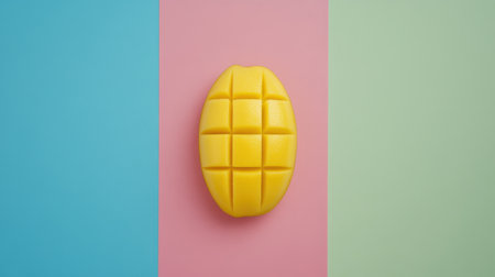 A bright yellow decorative item sits centrally on a colorful pastel background, featuring blue, pink, and green sections, evoking a sense of playfulness.