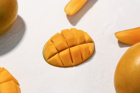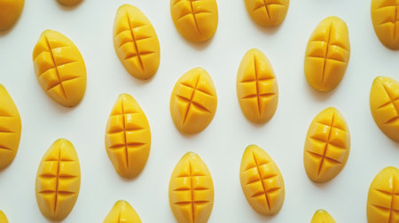This photo features a seamless arrangement of vibrant yellow mango slices on a pristine white background, ideal for fresh food designs or culinary projects.