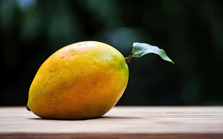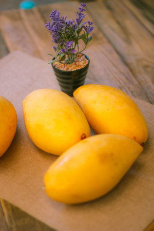 Ripe yellow mango fruit on wooden table with green leaves background.