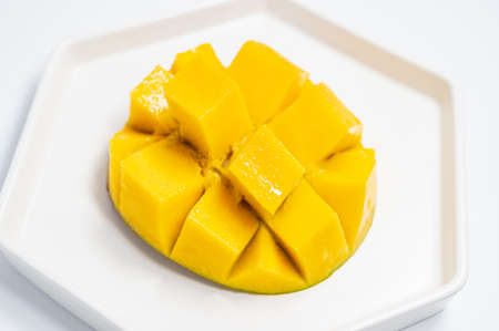 Tropical fruit, Mango on dish plate on white background. Copy space