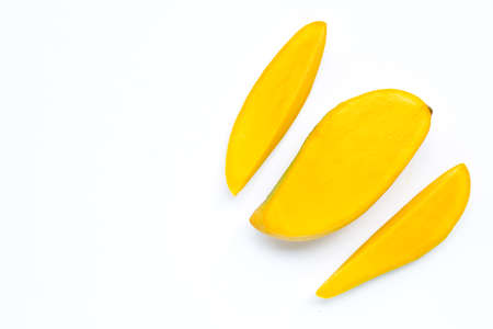 Fresh yellow Mango on white background. Tropical summer concept. Top view, close up, macro, copy space.