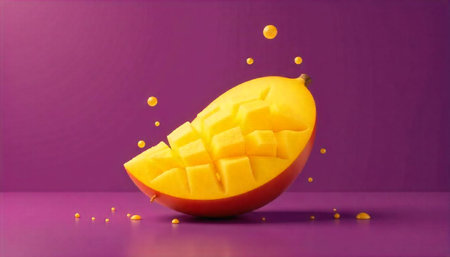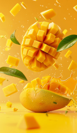 A mango soars through the air, bursting into square pieces while surrounded by droplets and vibrant colors, evoking freshness and flavor.