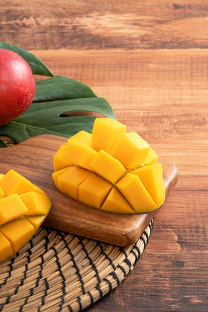 Juicy yellow mango cubes with whole mangoes on a green table background.