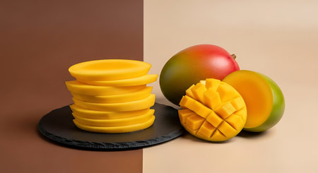Colorful mango slices beautifully arranged on a vibrant orange background offer a feast for the eyes, perfect for showcasing freshness and tropical flavors.