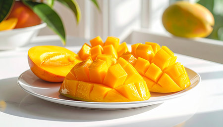 A white plate holds a halved mango and perfectly cubed mango pieces, illuminated by bright natural light.