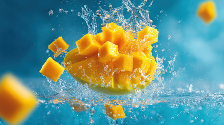 Bright yellow mango pieces leap from a half fruit into splashes of water under a vibrant blue backdrop.