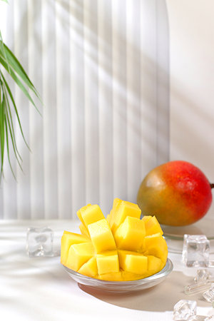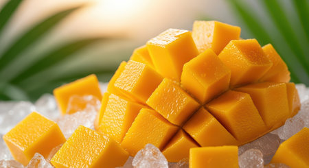 Fresh mango cubes on ice garnished with green leaves in sunlight