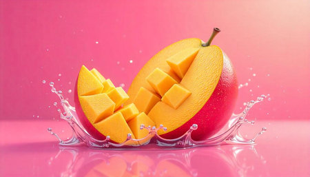 Ripe mango slices dropping into clear water, with a vibrant splash showcasing tropical freshness and juicy appeal.