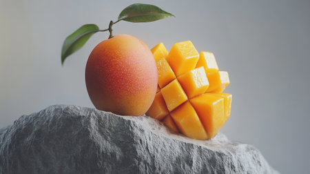 Close up serving fresh ripe cut mango dessert on gray stone table, elevated top view, directly above