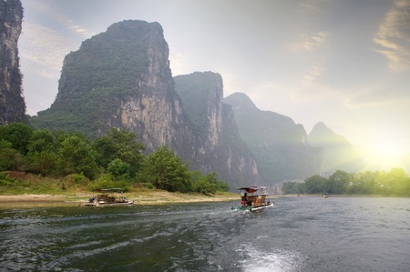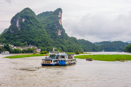 Yangshuo, China - July 14, 2010: Cruise ship with tourists travels the magnificent scenic route along the Li river from Guilin to Yangshou. The Li River is renowned as being one of “the world’s top 10 watery wondersâ€