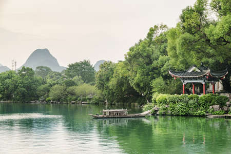 Amazing evening view of traditional Chinese pavilion by lake in park of Guilin, China. Beautiful summer landscape. Guilin is a popular tourist destination of Asia.
