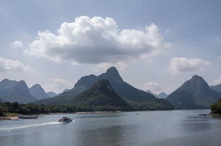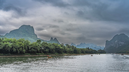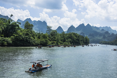 Tourist sail ships along the picturesque riverbed. Lush green vegetation on the shores. Mountains against the sky and clouds. Ripples on the surface of the water. China. Lee River.