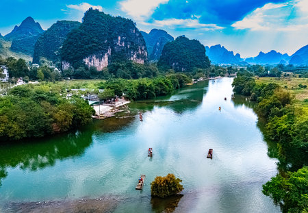 Panoramic view of karst mountains and Li river in Yangshuo, Guilin, China