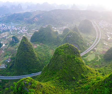 Aerial view of karst peaks by Jinbao River near Yangshuo in the Guangxi Region, China