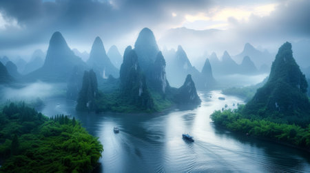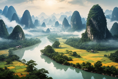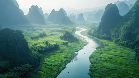A serene river winds through a valley of dramatic karst mountains, shrouded in soft morning mist and vibrant green foliage.